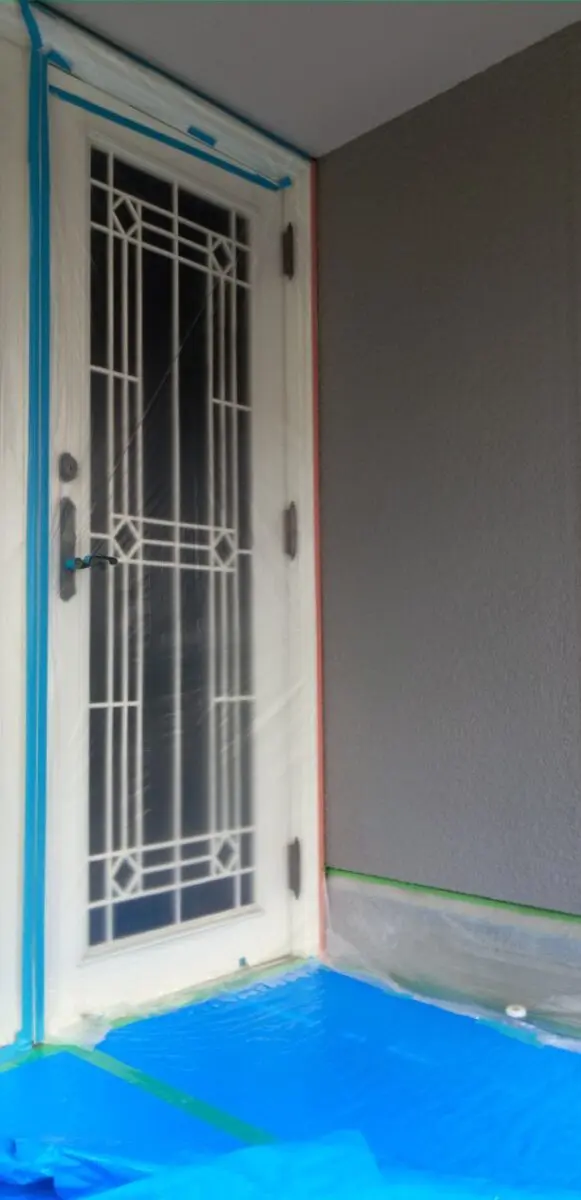 塗装中は玄関にもビニール養生を覆ってしまいますので、作業中は玄関から出入りができなくなります。