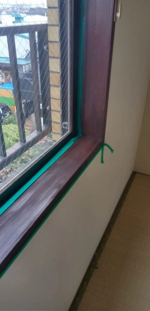 本日は和室の窓枠塗装です。窓枠は木目を残すためにオイル塗装をしました。はじめに窓枠に塗料がつかないようにマスキングテープで養生しました。