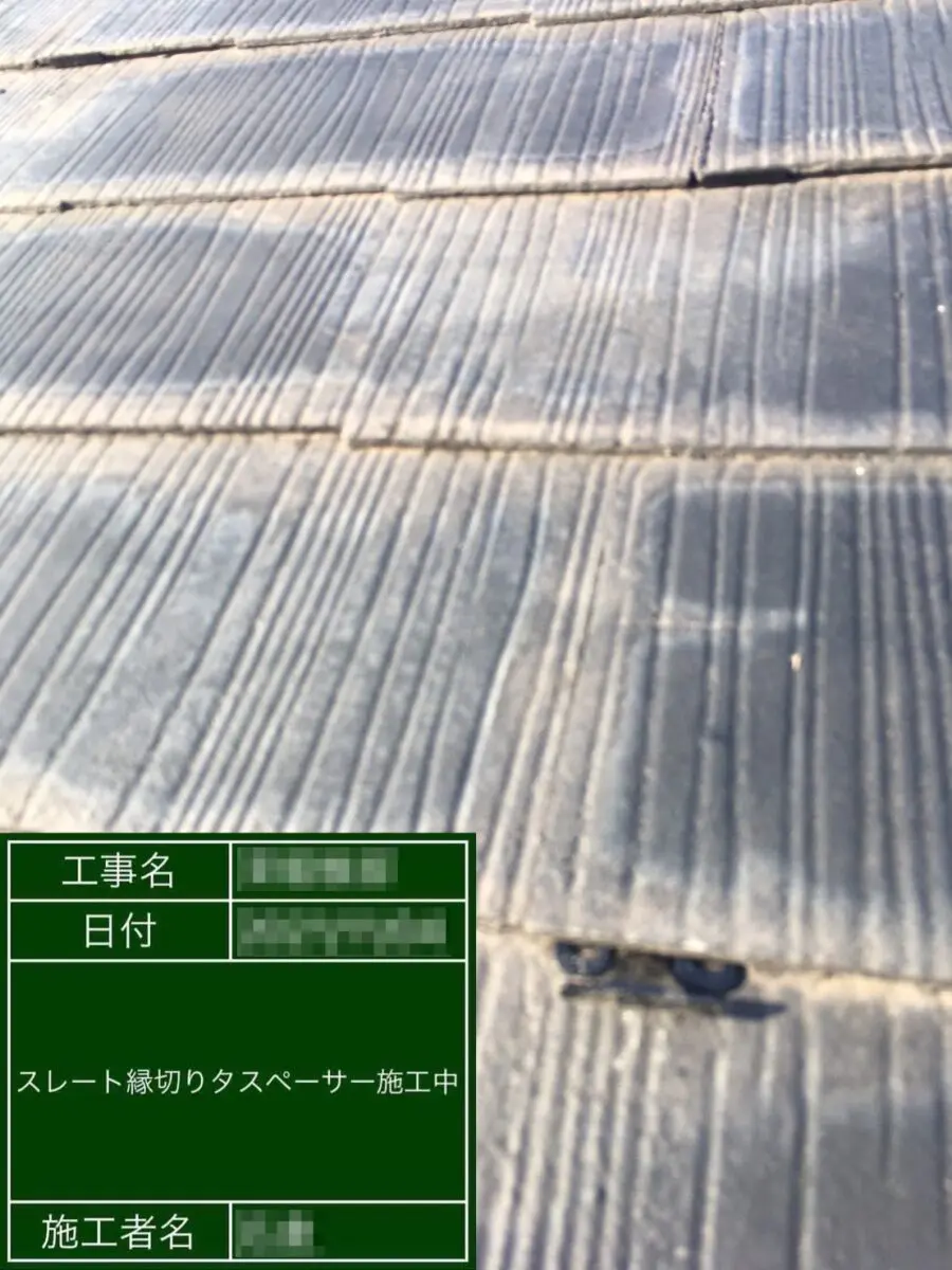 前回の現場レポートはスレート屋根の縁切りについてお伝えしました。縁切りの方法はカッターなどで塗膜を切り込みを入れる方法と今回ご紹介するタスペーサーの2つの方法があります。