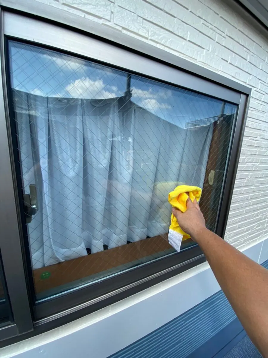 工事が終わったら、すぐに足場を外してお引き渡し、とはなりません。最後の最後まで仕上がりに問題ないか最終点検を行い、隅々まで清掃してきれいにしてからお客様にお引き渡しをします!窓も埃が付いていますので、洗剤を使ってきれいに拭き取ります!
