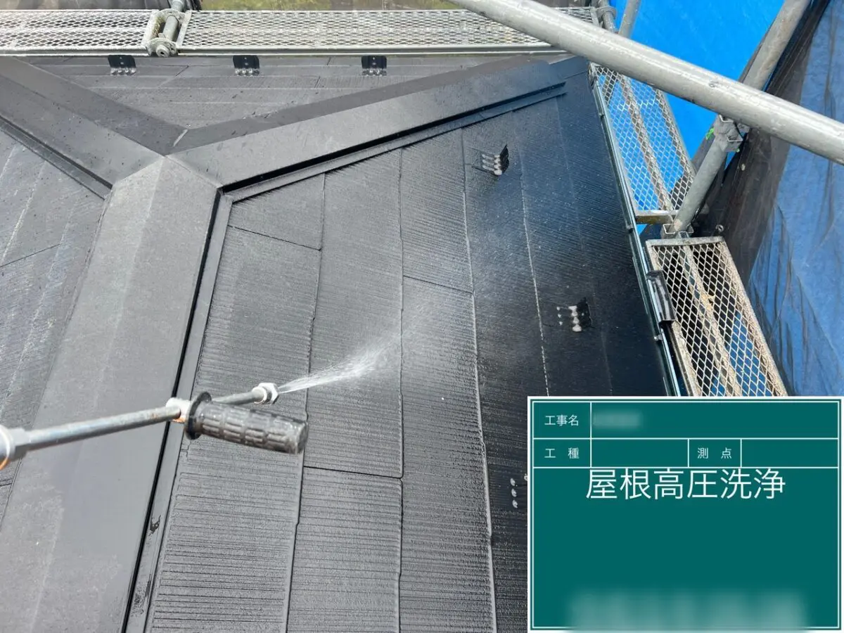 足場を設置した後は、高圧洗浄で屋根に付着する不純物を洗い流します。