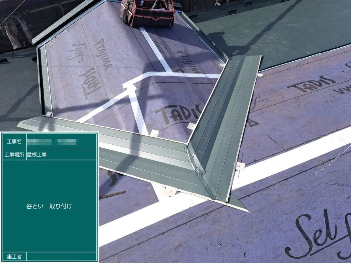 屋根の入隅にあたるところを谷と呼んでいまして、ここは水が集まってくるため、谷といという板金部材を取り付けます。