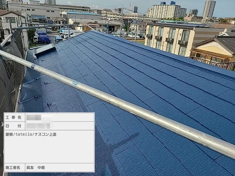 本日は屋根の水切り錆止め塗装とスレートの上塗りをレポートします。