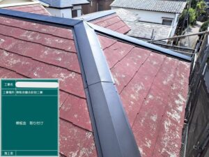 屋根の最上部に取り付けられている棟板金は、屋根材の継ぎ目を覆い、雨水の侵入を防ぐ重要な役割があります。
